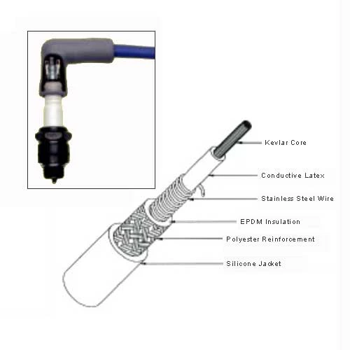 Kevlar core for maximum durability and long life. Durable stainless steel wound conductor for maximum horsepower and engine performance. Premium silicone jacketing and boots for the ultimate in high temperature protection. Superior RFI suppression for the most sensitiveelectronic system. Corrosion resistant stainless steel spark plug and distributor terminals for maximum conductivity.